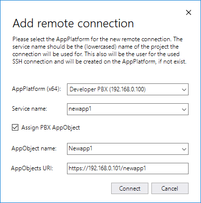The remote connection together with the AppPlatform connection is the information the innovaphone SDK extension needs to get access to the AppPlatform, configure the service, add an instance, deploy the binary and access the service using SSH to be able to debug it from within Visual Studio. While the PBX connection is used to setup the PBX app object, that is necessary for the UI to work and to let the PBX connect to your service via WebSocket. Please note that this also will enable the developer mode on both, the PBX as well as the AppPlatform.