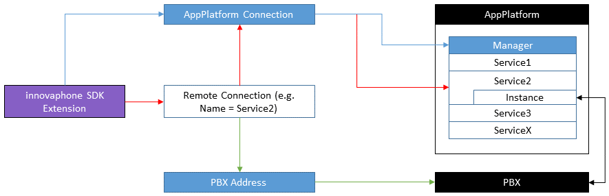 The following graph give you an overview. You can see, how the innovaphone SDK extension uses the AppPlatform connection communicates with the AppPlatform manager, while