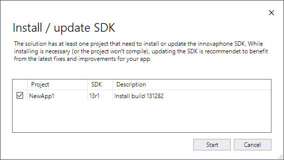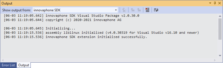 After you start Visual Studio you should wait for the innovaphone SDK extension to be initialized. Visual Studio wants the extension to be loaded asynchronously and there is no way to tell, that this extension needs to be loaded before the user can open a project using the innovaphone SDK. Usually it only takes a few seconds. However, you can open a solution or create a new project before the extension has been initialized, but this will lead to a delayed initialization of the extension and with that maybe some dialogs that will be displayed while you already start typing. And also some menu items will be disabled until initialization is completed. So finally, you need to wait, so it may be better to wait before opening an innovaphone SDK project.