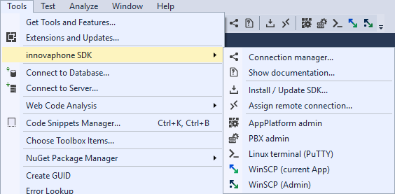 The innovaphone SDK extension provides some menu items (Tools - innovaphone SDK) to help you during development of your app as well as managing the connections. There is also a toolbar (if the toolbar is not