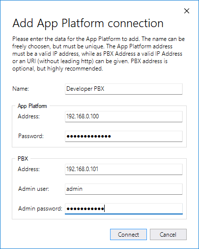 Adding a new AppPlatform connection is quite simple. Only a couple of data must be given. This is a unique name for the connection, the IP address of the AppPlatform and the password