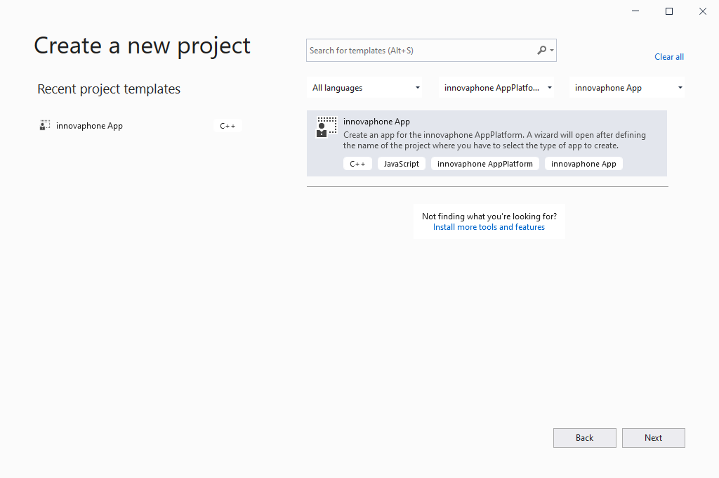Q: I installed everything and started Visual Studio, but cannot find the innovaphone App template when creating a new project.