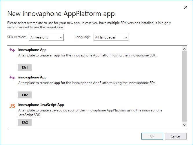 templates by the supported SDK version and / or the programming language to use. Please note that C++ means, that you're using C++ on the service part (the app running on the app platform), while JavaScript
