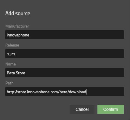 After that, the button Connect source will display a dialog to add a new source. There the most important field is the path, with should be the path from the source AppStore ending with "/download".