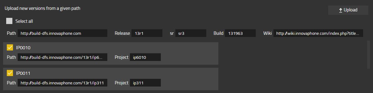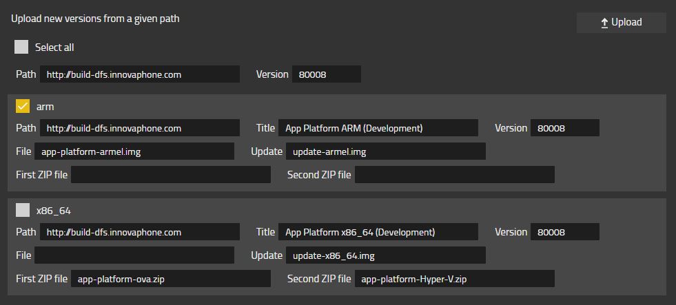 To upload apps, firmwares, softwares and app platforms a path is required, which has to point to a folder that contains the builds. These must be named after the build number.