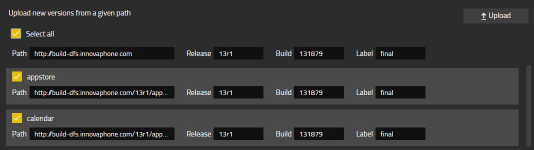 The upload of a new build for the software can be done with the upload menu, which is displayed by clicking on the Update button (upper-right corner). To upload the build for all the current softwares on the AppStore App, click on Select all and edit the Release, Build and Label data on the first row. The changes will be automatically applied to all the software. With the Upload button the binaries of the selected softwares are uploaded to the AppStore App.
