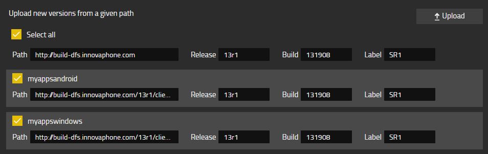 The upload of a new build for the app platform can be done with the upload menu, which is displayed by clicking on the Update button (upper-right corner). To upload the build for all the current app platforms on the AppStore App, click on Select all and edit the Version data on the first row. The changes will be automatically applied to all the app platforms. With the Upload button the binaries of the selected items are uploaded to the AppStore App.